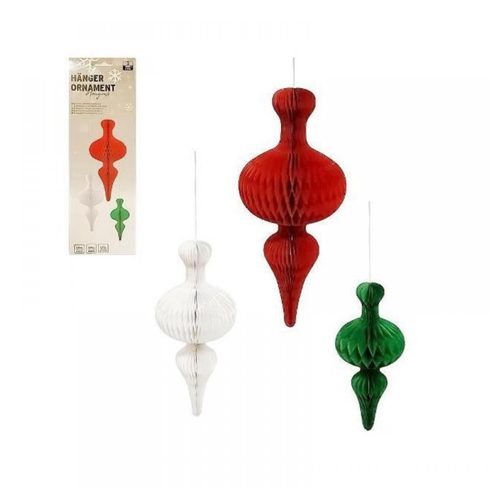 Набір підвісних прикрас Honeycomb "Фонарик" включає 3 елементи різних розмірів і кольорів: зелений - 6×15 см, білий - 9×20 см, червоний - 13×30 см. Паперові прикраси виконані в техніці "соти", завдяки чому виглядають об’ємними та повітряними.