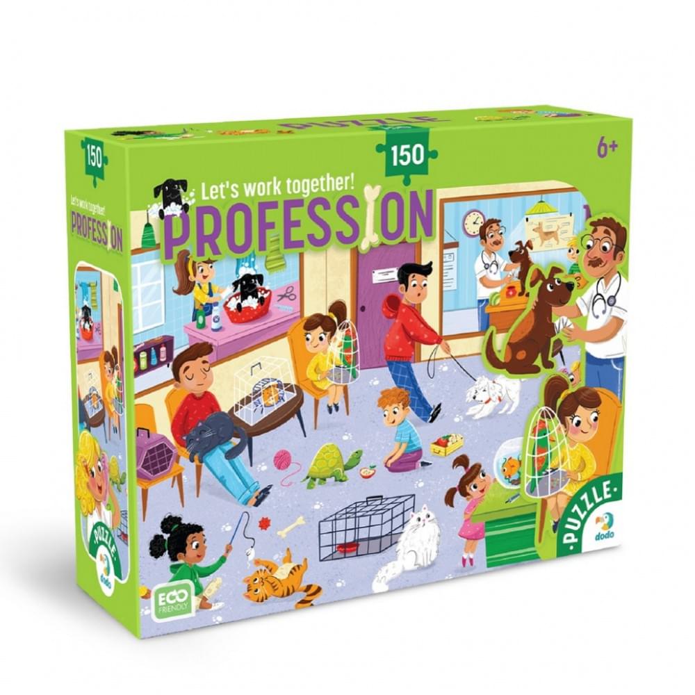 Пазл Dodo "Професії: Ветеринар" складається зі 150 елементів і перенесе вашу дитину у світ турботи про тварин. На яскравій ілюстрації зображена ветеринарна клініка, де працює доброзичливий ветеринар, який оглядає та лікує різних домашніх улюбленців. Клієнти зі своїми тваринами чекають на прийом: тут є котики, собачки, пташки, черепашки та навіть рибки.