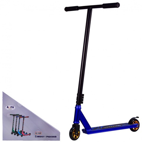 Самокати трюкові Колір: Синій Вік: 7 + Максимальне навантаження, кг: 100 кг Характеристики: КЕРМО Матеріал - Сталь Тип - T - образний Висота, мм - 700 мм Висота від деки, мм - 870 мм Ширина, мм - 540 мм Матеріал грипс - TPR Компресія - IHC Хомут - Алюмінієвий, 3-х болтовий ДЕКА Матеріал - Алюміній 6061 T6 Ширина, мм - 100 мм Довжина, мм - 480 мм Довжина (футспейс), мм - 350 мм КОЛЕСА Діаметр, мм - 100 мм Матеріал - Поліуретан /PU Жорсткість - 84А Підшипники - ABEC 7 Chrome Диск - Алюмінієвий /шпицевий ВИЛКА Матеріал - Сталь