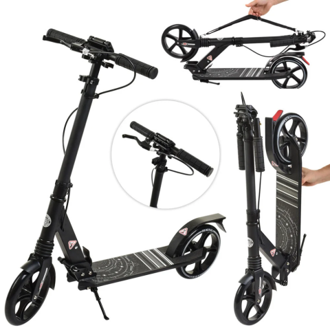 Самокат - засіб пересування, що приводиться в рух шляхом відштовхування ногою від землі в положенні стоячи. Самокат використовується не тільки в якості персонального транспорту, але і для проведення дозвілля, заняття спортом і фізкультурою. Характеристики: Максимальна навантаження-85 кг Складна конструкція Матеріал алюміній + сталь Колеса 2 шт ПУ 200 мм Ручне гальмо Руль 80-112 см Амортизатори Замок Підніжка 44-12 см Підставка У коробці 73-13-34 см