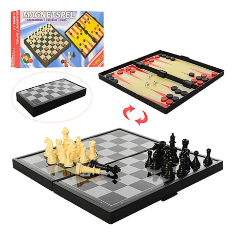 Чудовий і практичний домашній набір для гри в шахи, шашки та нарди на магнітах.Набір складається з пластикової коробки, яка розкладається в ігрове поле з магнітними елементами.У наборі також присутні кубики для гри в нарди.