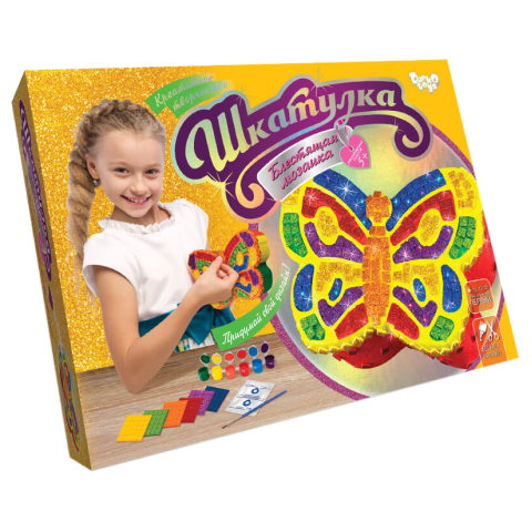 Дитина зможе створити справжній витвір мистецтва власними руками, відкриє нові таланти. У дитини розвивається дрібна моторика пальців, акуратність, логічне мислення.Особливістю даного набору є простота виконання: розфарбовування акриловими фарбами форми-заготівлі та декорування готового виробу дизайнерськими матеріалами.Комплект містить:- скринька пінополістиролова;- комплект із 6 кольорів акрилової фарби на водній основі;- пензлик;- комплект різнокольорових палеток на самоклейці;- акриловий лак на водяній основі;- Інструкція.