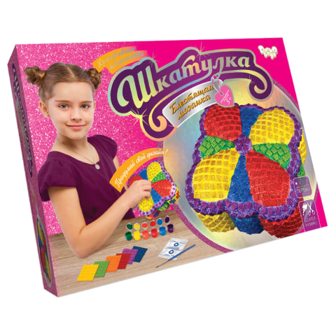 Дитина зможе створити справжній витвір мистецтва власними руками, відкриє нові таланти. У дитини розвивається дрібна моторика пальців, акуратність, логічне мислення.Особливістю даного набору є простота виконання: розфарбовування акриловими фарбами форми-заготівлі та декорування готового виробу дизайнерськими матеріалами.Комплект містить:- скринька пінополістиролова;- комплект із 6 кольорів акрилової фарби на водній основі;- пензлик;- комплект різнокольорових палеток на самоклейці;- акриловий лак на водяній основі;- Інструкція.