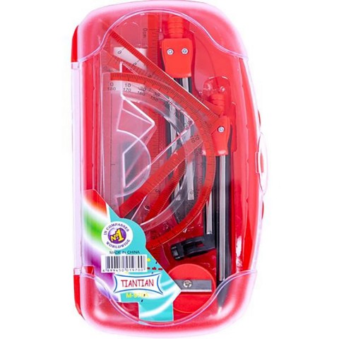 Набір креслярських інструментів у пластиковій коробці. У наборі 8 предметів: циркуль під олівець (довжина - 12 см), гумка, простий олівець (довжина - 8,5 см), точилка, лінійка (довжина - 15 см), транспортир, 2 трикутники. Матеріал: пластик. Розмір 18 х 9 см