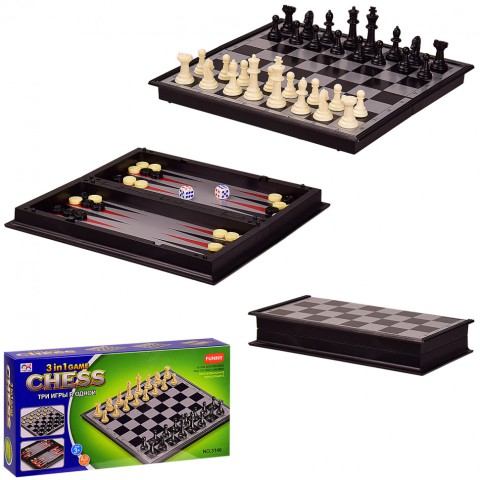 Настільна гра 3 в 1Набір з 3 ігор: шахи, шашки та нарди - вони є одними з найбільш популярних настільних ігор. Набір з двостороннім дошкою, одна сторона для шахів і шашок, а інша для гри в нарди. Такий набір зручно брати з собою в дорогу. Всередині ігрового поля зберігаються фігурки, за принципом шкатулки. Дані гри розширюють кругозір, стимулюють роботу мозку, розвивають логічне і стратегічне мислення і покращують пам'ять.У комплекті:- двостороння ігрова дошка- фігурки- кубики (2 шт.)