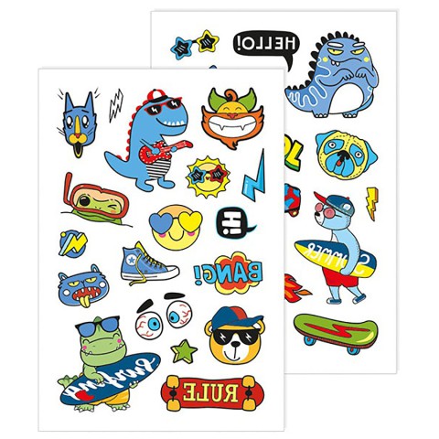 Вирушайте у світ пригод разом із набором яскравих тимчасових тату! У кумедному пакуванні з динозавриком ховаються 2 аркуші зі 35 стильними татушками: динозаврики з гітарами та скейтами, жабеня в масці, смайлики та модні надписи, які точно сподобаються маленьким непосидам.
