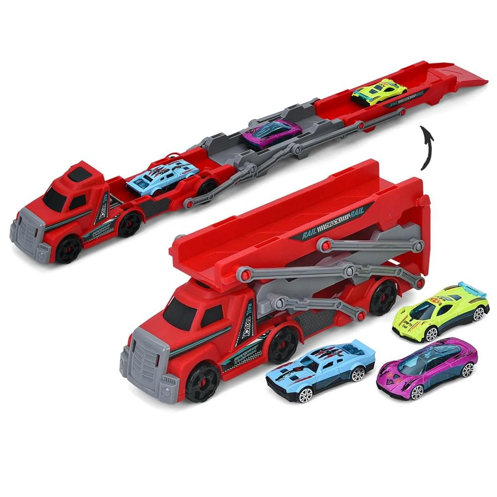 Трейлер 23,5 см, що розкладається в трек 60 см з запуском 3 метал машинок – для дітей від 3 років. Розвиває логіку, моторику. Метал міцний, пластик безпечний. Батьки оцінять багатофункціональність. Ідеальний для гонок, роблячи гру динамічною.
