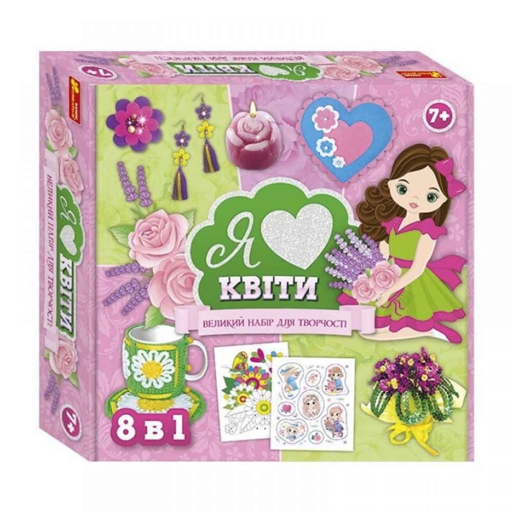 У наборі: паєтки, бісер, дріт, пластиковий стаканчик, органза, стрічки, гіпс, синтепон, намистини, нитки, гачок для в’язання, голка, швензи, кільця, деталі з фетру, шпилька для брошки, волосінь, парафін, барвник для парафіну, блістерна форма, фітиль, наліпки, релакс-розмальовка, інструкція.