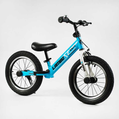Біговел Corso Lambo LB-14802 колеса 14", гальмо, дзвінок – старший модель біговелу з великими 14" колесами, ручним гальмом та дзвінком. Міцна конструкція, регулювання сидіння.