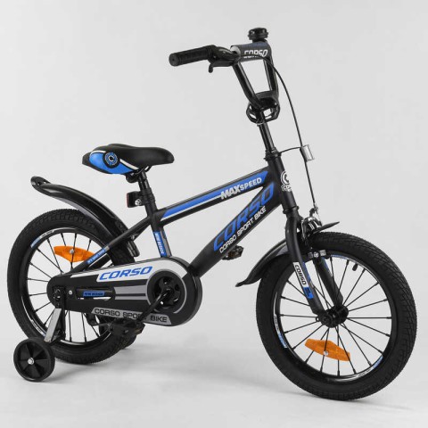 Сталева рама, сталеві протиударні диски, комплектація якісним обладнанням. Велосипед призначений для дітей віком від 4 до 6 років, зростом від 100 см до 125 см. Характеристики: Легка вага. Переднє ручне гальмо і заднє ножне гальмо. Зручні якісні гріпси керма (гумові ручки на кермі). Унікальне матове і глянсове фарбування. М'яке, комфортне сидіння. Сталеві протиударні диски 16 ". Каретка: American (Американка). Додаткові бічні страхувальні колеса. Дзвіночок на кермі.