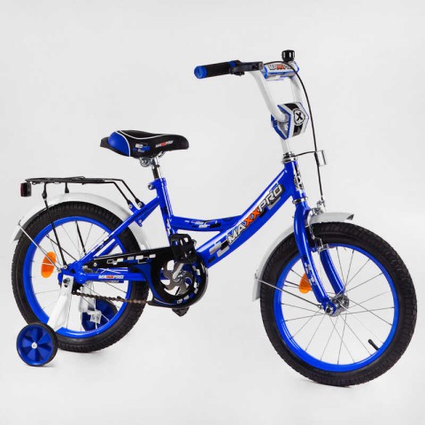 Характеристики: Возраст: 5-6 лет, рост: 110-115 см. Диаметр колес: 16 дюймов, колеса с надувной камерой на металлических дисках со спицами. Над каждым колесом установлены крылья. Каретка: American (Американка). Высота сидения и руля регулируется. Сидение с небольшой родительской ручкой. Тормоз: задний - ножной, передний - ручной. В комплекте страховочные колеса. Дополнительно велосипед оборудован металлическим багажником с зажимом, а также механическим звонком. Велосипед собран на 75%.