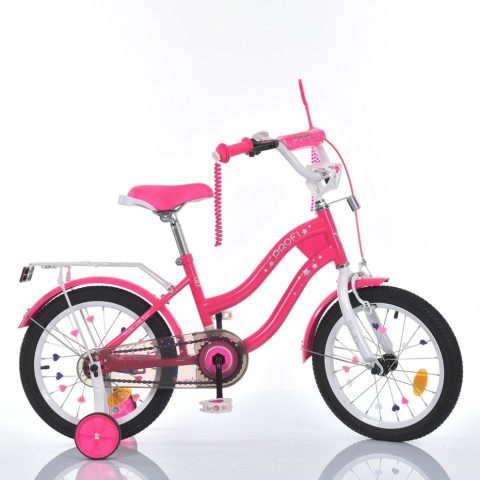 Дитячий велосипед на 16 дюймових колесах із дзвінком і багажником STAR PROF1 MB 16063Дитячий велосипед MB 16063 STAR, 16 дюймів - спеціально розроблений для дівчаток і має всі необхідні характеристики, щоб забезпечити комфорт і безпеку вашій дитині.Велосипед дитячий MB 16063 - має комфортне регульоване за висотою сидіння і кермо, що дає змогу налаштувати велосипед під зріст і зручність вашого малюка, забезпечуючи правильне положення тіла під час катання.Двоколісний велосипед MB 16063 - виконаний з турботою про комфорт і безпеку дитини, щоб ваш малюк відчував себе впевнено і безпечно, в комплект входять допоміжні страхові коліщатка. Вони допоможуть вашому малюкові освоїти мистецтво велосипедного катання, не побоюючись впасти.Характеристики:Матеріал рами: стальКермо: 1-болтове кріпленняМ'яка накладка на керміУ комплекті: ліхтарик, дзвінок і дзеркалоСидіння: шкірозамінникВисота сидіння регулюєтьсяКаретка розбірна, на насипних підшипникахСистема шатунів: одноелементна зі знімною зіркоюЗахист ланцюга: повнийГальма: переднє - кліщове, заднє - педальнеГумові колеса - 16 дюймівДодаткові коліщатка страховкиПедалі: пластмаса з бічними відбивачамиКрила переднє і заднєКатафоти: спереду, ззаду, на колесахМеталевий багажникВелосипед зібраний на 75%