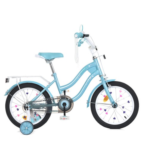 Дитячий велосипед на 16 дюймових колесах із дзвінком і багажником STAR PROF1 MB 16063Дитячий велосипед MB 16063 STAR, 16 дюймів - спеціально розроблений для дівчаток і має всі необхідні характеристики, щоб забезпечити комфорт і безпеку вашій дитині.Велосипед дитячий MB 16063 - має комфортне регульоване за висотою сидіння і кермо, що дає змогу налаштувати велосипед під зріст і зручність вашого малюка, забезпечуючи правильне положення тіла під час катання.Двоколісний велосипед MB 16063 - виконаний з турботою про комфорт і безпеку дитини, щоб ваш малюк відчував себе впевнено і безпечно, в комплект входять допоміжні страхові коліщатка. Вони допоможуть вашому малюкові освоїти мистецтво велосипедного катання, не побоюючись впасти.Характеристики:Матеріал рами: стальКермо: 1-болтове кріпленняМ'яка накладка на керміУ комплекті: ліхтарик, дзвінок і дзеркалоСидіння: шкірозамінникВисота сидіння регулюєтьсяКаретка розбірна, на насипних підшипникахСистема шатунів: одноелементна зі знімною зіркоюЗахист ланцюга: повнийГальма: переднє - кліщове, заднє - педальнеГумові колеса - 16 дюймівДодаткові коліщатка страховкиПедалі: пластмаса з бічними відбивачамиКрила переднє і заднєКатафоти: спереду, ззаду, на колесахМеталевий багажникВелосипед зібраний на 75%