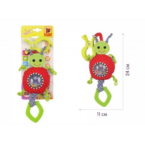 Забавна вібруюча іграшка створена для наймолодших «дослідників».Малюки будуть в захваті: маленькі кульки в брязкальця голосно дзвенять і веселять дитину, «смачний» прорізувач відверне від «зубних питань».Потягніть за іграшку, і вона почне дзвінко вібрувати.Іграшка приємна і м'яка на дотик, тому що виконана з натуральних слинопоглинаючих матеріалів.Завдяки універсальному кріпленню іграшку можна закріпити на колясці, ліжечку, автокріслі або до дуг розвиваючого килимка.Склад: бавовняна тканина; різнофактурні матеріали; швейна фурнітура; звукові елементи; холлофайбер; вібромеханізм.Розмір: 11,5 × 17 × 6 см.