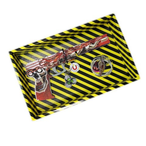 Дерев'яний пістолет у зібраному вигляді. Усі деталі продумані та виконані з екологічних матеріалів. Іграшка стріляє гумками для грошей (гумки є в комплекті), для них також є зручне кріплення на пістолеті. У набір також входять два брелоки та наліпки. Розмір зброї 25х14х1 см. Аксесуари можуть трохи відрізнятися від представлених на фото. Упаковка: Коробка Колір: Різнокольорові Вага з упаковкою: 245 г Габарити в упаковці: 5 x 29.5 x 19 см Габарити без упаковки: 1 x 25 x 13 см Країна виробник: Україна Матеріал: Дерево Комплектація: Гумка, гумки, 2 брелоки, наклейки.