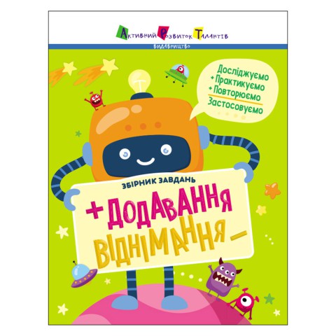 Спробуйте вивчати додавання та віднімання різними способами через ілюстровані завдання. Числоробот допоможе вам у цьому. Він покаже та розкаже всі секрети швидкого та безпомилкового додавання й віднімання. Збірник завдань ""Додавання, віднімання"" містить пояснення математичних дій, демонстрацію різних способів, практику після теорії та веселі сюжети завдань. Тож нудьгувати не доведеться.Досліджуйте, практикуйте, повторюйте та застосовуйте!